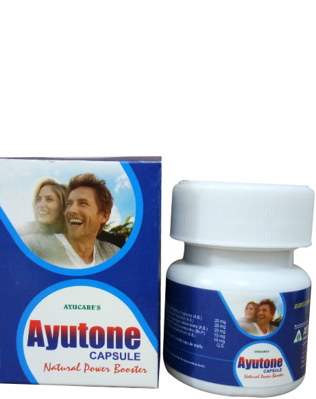 Each capsule contains: Giloy, Gokshur and Amla each 55 mg, Sunthi, Shatavari, Ashwagandha, Vidarikand and Konchbeej each 50 mg, Jayphal, Javantri and Safedmusli each 20 mg, Salampanja 15 mg, Ela 10 mg Dose: 1 to 2 capsules twice a day preferably with milk or as directed by the physician. Packing: Ayutone capsule is available in container of 30’s, 60’s, 100’s & 500’s. Ayutone is a superb non-alcoholic tonic. It revitalizes body cells and nervous system. Ayutone is recuperative, constructive & rejuvenative tonic. Indication: General and geriatric tonic