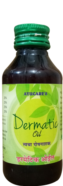 Ayurvedic Oil For Skin problems | Skin Care | Dandruff Ingredients: Marichyadi tail, Jatyadi tail, Karanj tail & Neem tail. Packing: Dermatic oil is available in 60 ml,100 ml, 200 ml & 500 ml PET Bottle. Dermatic oil is useful in skin diseases like Itching, Urticaria, Dermal affections, Skin allergies, Psoriasis, Dandruff and other skin eruptions. Simultaneous use of Dermatic syrup and Dermatic capsule gives best results. How to use: Apply Dermatic oil 3 to 4 times a day for 1 to 2 weeks & then as required or as directed by the physician.