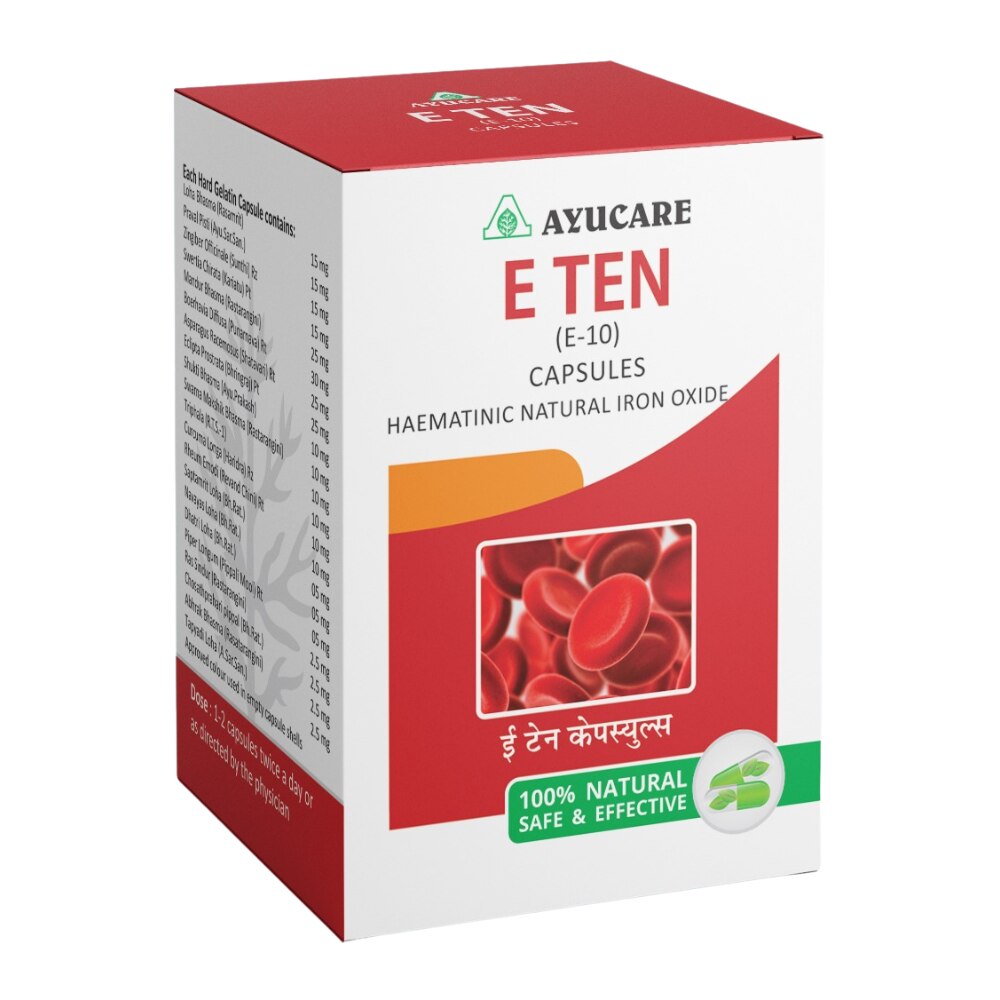 Ayurvedic Iron Tonic | Hematinic Tonic Each capsule contains: Punarnava 30 mg, Shatavari, Bhringraj and Mandur Bhasma each 25 mg, Loha Bhasma, Praval pisti, Sunthi and Kariatu each 15 mg, Haridra, Revand chini, Shukti bhasama, Swarna makshik Bhasma, Triphala and Saptamrit loha each 10 mg, Pippali mool, Navayas loha and Dhatri loha each 05 mg, Ras sindur, Chosathprahari pippal, Abhrak Bhasma and Tapyadi loha each 2.5 mg Dose: 1-2 capsules twice or thrice a day or as directed by the physician. Packing: E-10 is available as capsule in container of 30’s, 60’s, 100’s & 500’s. Powerful hematinic causing no gastric disturbances, E-10 supplies most absorb ate powerful bhasmas along with other hematopoietic non-toxic herbal preparation. Indication: Useful in iron deficiency, Anemia during pregnancy and lactation period & debilitating.