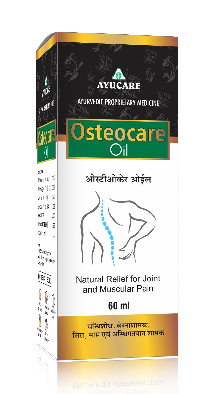 Ayurvedic Pain Relief Oil | Pain Oil | Muscle Relief Oil Ingredients: Mahanarayan tailam, Bala tailam, Mahavishgarbh tailam, Panchgun tailam, Ashwagandha tailam & Mahamash tailam. Packing: Osteocare oil is available in 60 ml,100 ml, 200 ml & 500 ml PET Bottle. Osteocare oil is useful in Musculoskeletal disorders like Rheumatic arthritis, Rheumatoid arthritis, Osteo-arthritis, Cervical and Lumbar Spondylosis, Sciatica, Slip-disk, non-specific Rheumatism. Dosage: Apply Osteocare oil 3 to 4 times a day for one week and then as required or as directed by the physician. Simultaneous use of Osteocare capsule produces satisfactory results.
